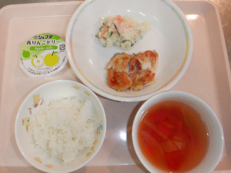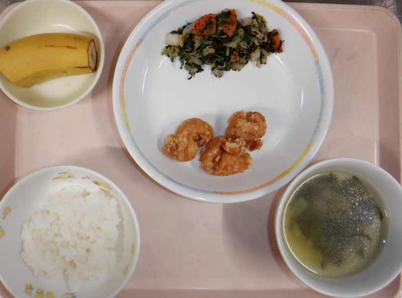 ※シークレットメニューは献立配付の際、食材だけをお知らせして園児とご家族の方とでメニューを予想する食育の試みです。今回の答えは『唐揚げ』でした!